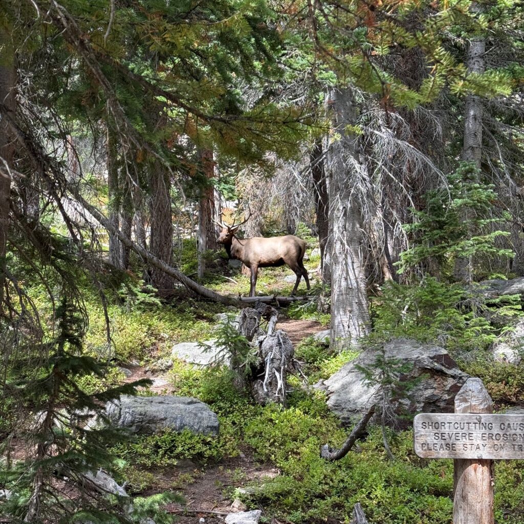 On our way up to The Loch, Josh and I spotted a massive bull elk. We gave it a wide berth while it kept watch over its harem of lady elk grazing a few yards away.
